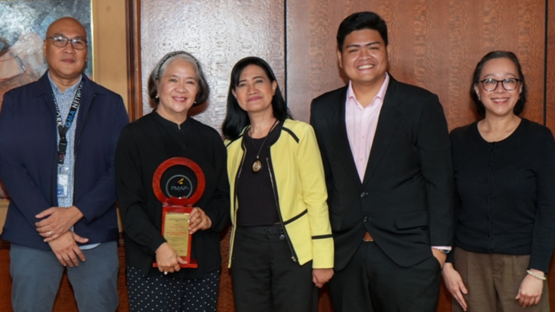 Presenting the award to Mrs. Enriquez were 2022 PMAP President and Board of Trustee for Media and Communications member Ellen Fullido; PMAP Communication Specialist and Makatao Awards for Media Excellence Program Lead Martin Alcantara; Training Head Richard Mamuyac, and HR Head Bernadette Tan.